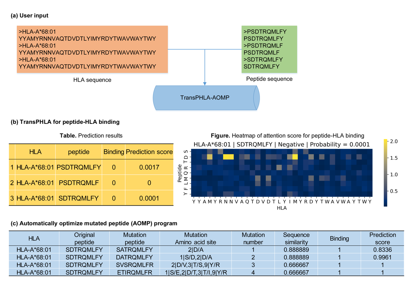 人类白细胞抗原(HLA)和肽(pHLA)之间相互作用的计算预测可以加快表位筛选和疫苗。该研究开发了TransMut框架,包含了用于pHLA结合预测的TransPHLA和用于突变肽优化的AOMP程序,它可以推广到生物分子的任何结合和突变任务(图1)。