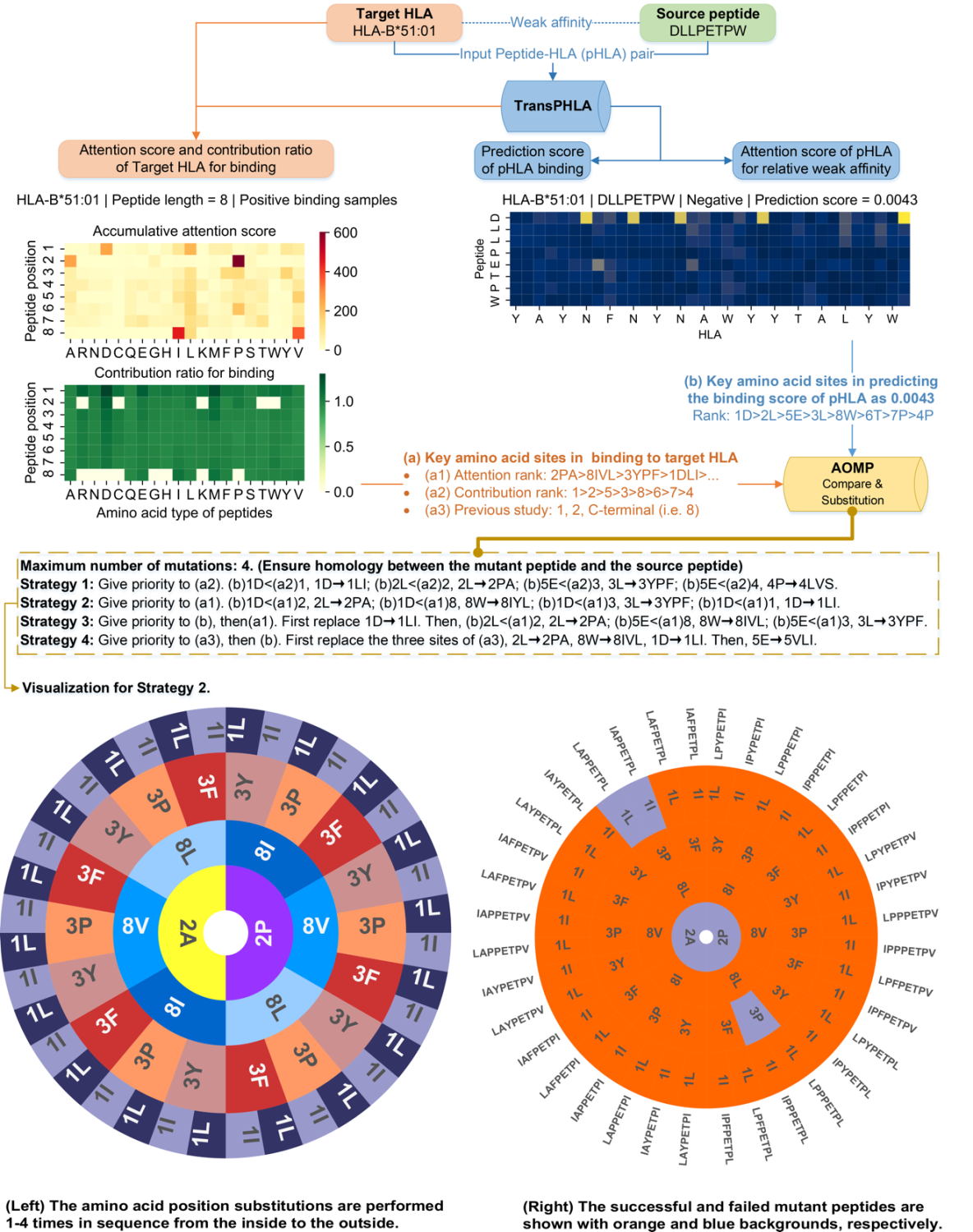 基于TransPHLA获得的注意力机制,开发了AOMP程序(图6)用于肽疫苗设计。当用户提供一对源肽和目标HLA时,AOMP程序可以搜索对目标HLA具有更高亲和力且不超过4个突变位置的突变肽。该程序既保证了突变肽与目标HLA的亲和性,又保证了突变肽与源肽的同源性,从而触发交叉免疫。