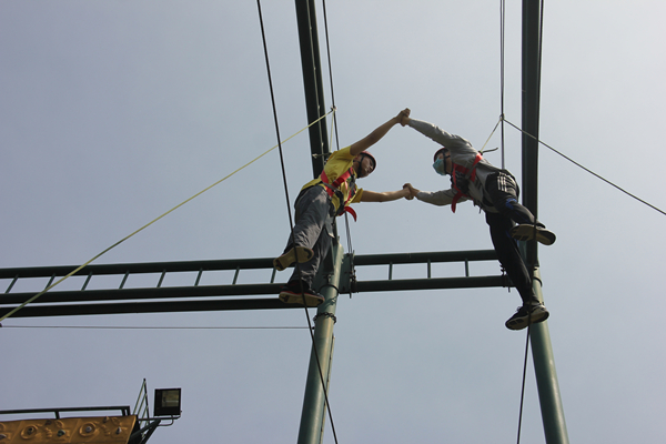 “高空抓杆”项目需要同学们在佩戴好安全装备之后爬上3层楼高的梯子,纵身一跃抓住前方的杆,而“生死相依”项目要求两名搭档之间密切配合,握住对方虎口,绷直身体保持平衡,横向移动走过钢索。