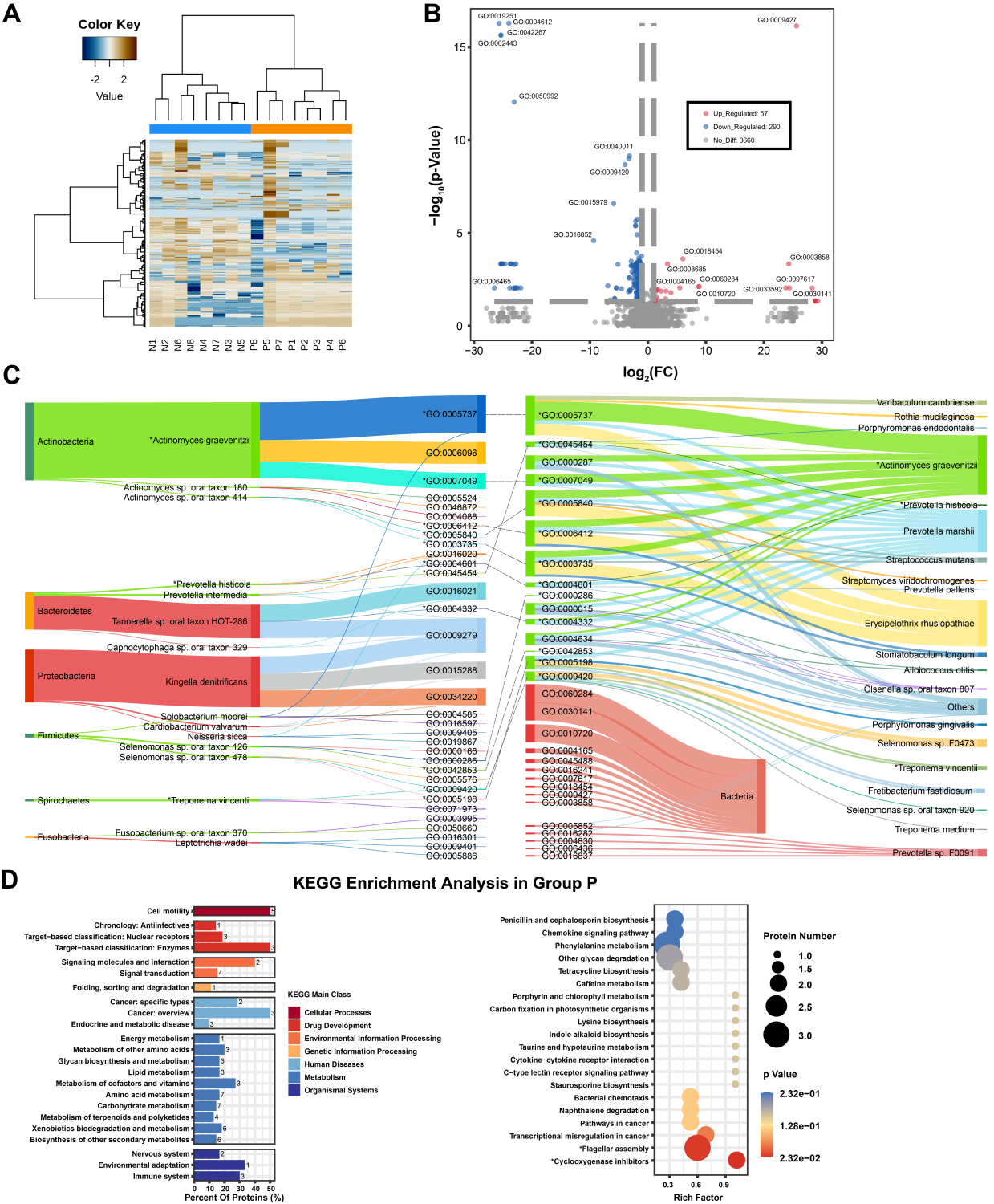 研究人员首先在样品前处理阶段利用差速离心和双滤膜过滤法,有效地将样品中的宿主细胞和蛋白与微生物进行分离,显著降低了宿主蛋白对微生物鉴定的干扰,提高了微生物的蛋白鉴定数量和实验重现性。其次,研究人员构建了适合复杂微生物分离制备的电泳体系,同时实现了对低丰度微生物的富集,进一步提升了微生物蛋白的鉴定效率,将口腔微生物蛋白的鉴定数量提高了新水平。再次,通过整合的宏蛋白质组学数据处理工具,研究人员不仅对口腔微生物组的蛋白质功能进行了探究,还对微生物的物种构成和各物种所执行的功能进行了联合分析。最后,研究人员系统比较了肺癌患者口腔微生物组与正常对照组的差异,发现并验证了两种在肺癌中执行紊乱功能的口腔微生物。该研究创建的宏蛋白质组学新策略将有助于全面分析复杂微生物组所执行的功能,并为深入探究微生物组与疾病的关系提供了新工具。