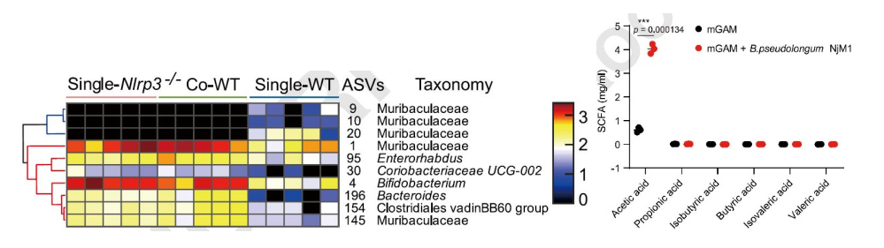 接下来,他们分析了四组小鼠的肠道菌群结构(下图2左),并从Nlrp3-/-小鼠的肠道菌群中分离到一株假长双歧杆菌(Bifidobacterium pseudolongum) NjM1,该菌株能产生乙酸(下图2右)并在野生型小鼠体内抵抗IAV感染(下图3a, b, c)。